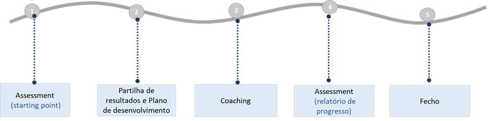 O nosso modelo de coaching é uma estrutura de desenvolvimento projetada para alcançar resultados comportamentais, desafiar potencialidades e equacionar desenvolvimentos de carreira. Este divide-se em 5 fases conforme imagem.